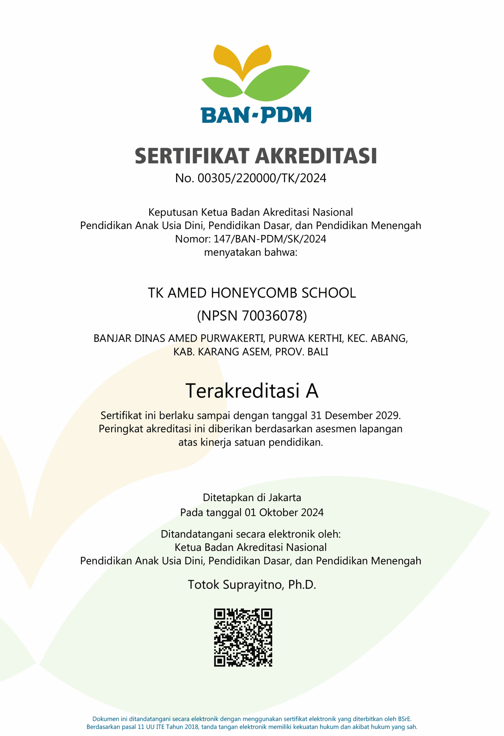 Our Early Years (TK) level is accredited at Level A, the highest rating awarded by BAN PAUD dan PNF. This reflects the quality of our learning environment and our compliance with national standards.